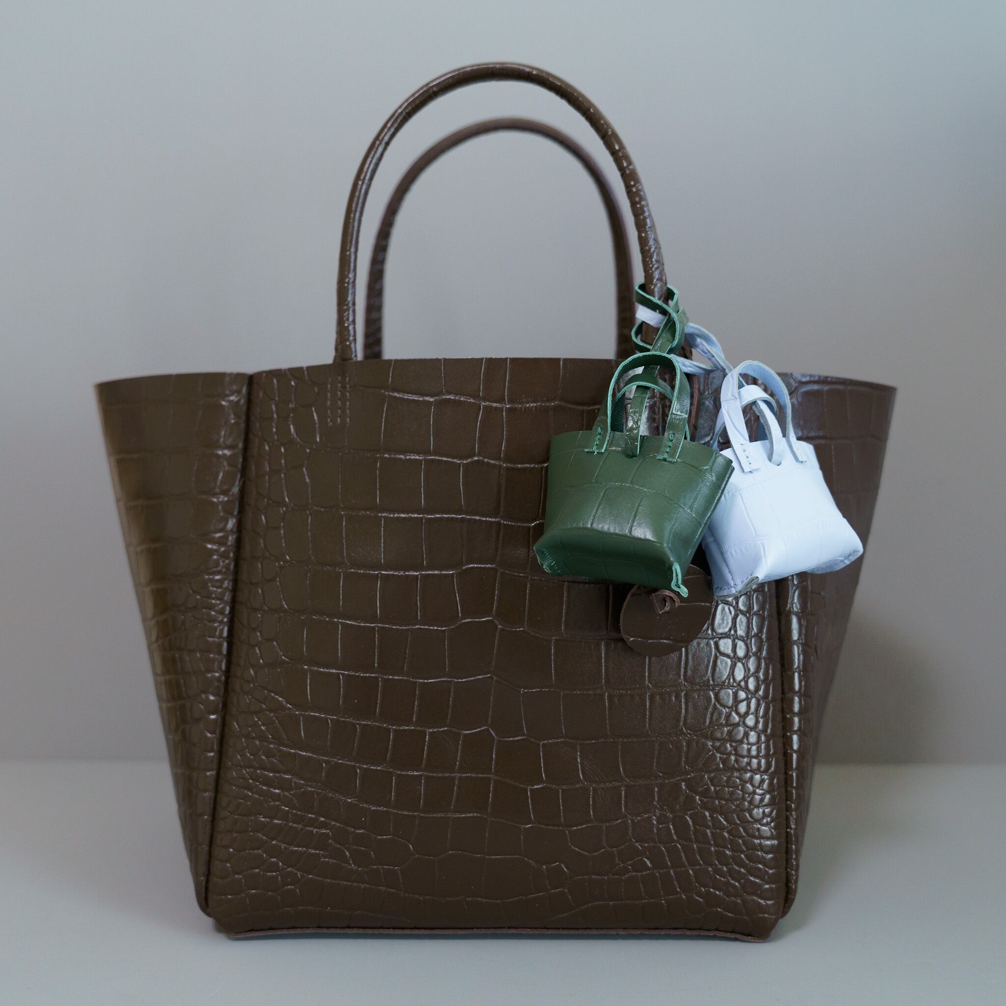 クロコ型押しレザーは模様の出方に個体差があり、一点ずつ異なる表情が魅力です。